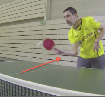 Ce joueur pongiste renvoie en revers à la façon d'un "essuie glace" en jouant avec son côté pouce, ce qui l'empêche de varier l'ouverture de la palette :
